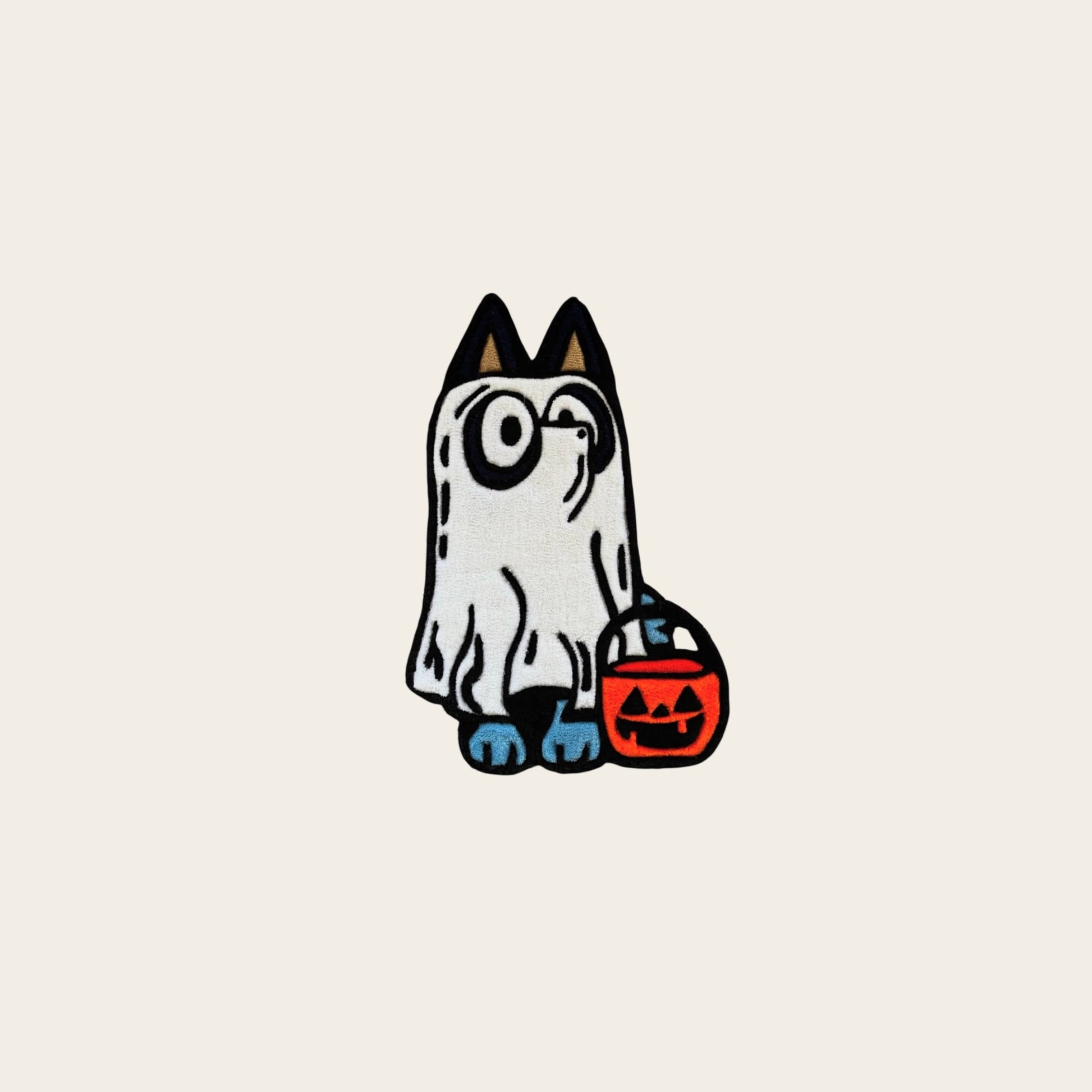 This hand-tufted rug, inspired by the beloved character from the Bluey series, brings a fun and adorable twist to spooky season. Dressed as a ghost and holding a pumpkin candy bucket, Bluey adds a touch of cute and festive charm to your space.