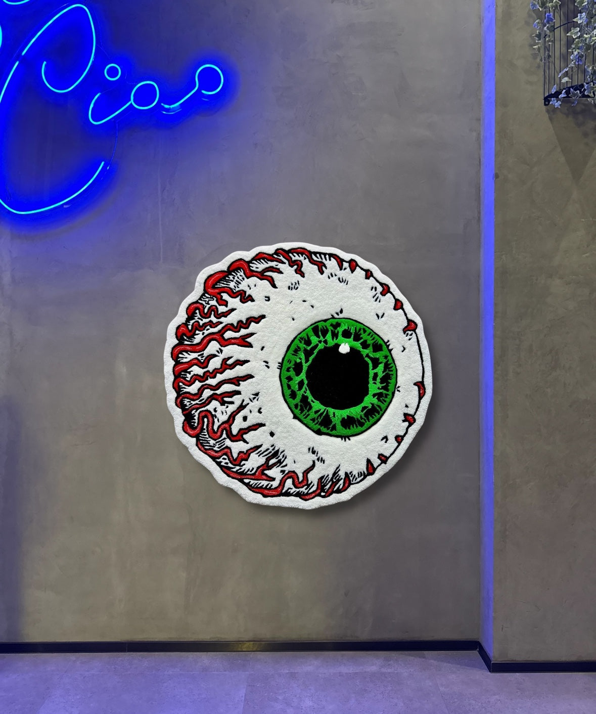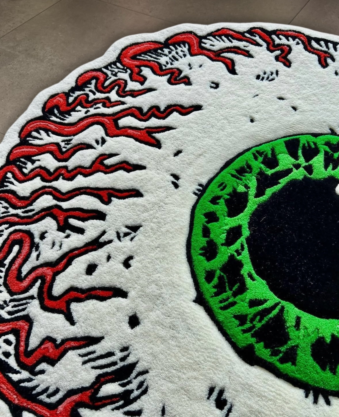 Add a bold touch of horror and pop art to your space with this hand-tufted “Eye” rug, featuring a hyper-detailed green iris and red veins that seem to come to life. Both eerie and mesmerizing, this design captures the perfect balance between creepiness and art a statement piece that won’t go unnoticed.